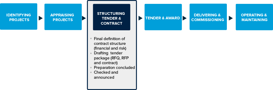As explained in the introduction, the choice of procurement model will influence the timing of the finalization of the PPP contract structure and of the requests for qualifications and proposals. However, for convenience this chapter assumes that all structuring and drafting of the whole tender package (contract, RFQ and RFP) is prepared during this phase before launching the tender as if it were a one-stage process.