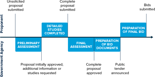 · Proposals are welcome that comply with the detailed requirements set out and are evaluated in the same way as government-originated projects. · Proposals for PPPs requiring no government oversight or support are advertised for 90 days (or 120 days for PPPs requiring government support). If no competing proposal is received, the government may negotiate directly with the proponent.[79] |