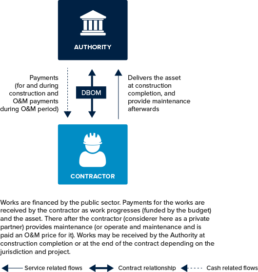 Thesecontractsarereferredto asDBOM(design, build, operate and maintain). If the contractor is not responsible for operating[14] the infrastructure, the contract is usually referred to as a DBM. Under a DBOM contract, maintenance work is pre-contracted and is paid for directly by the government at a pre-agreed price. See figure 1.4.