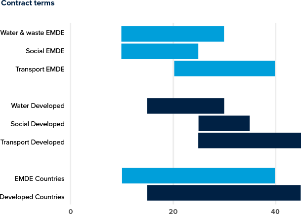 In general, the terms will often be shorter contracts in EMDE countries. This may be due to many factors, including the more limited terms available for financing, potentially higher restrictions by law (shorter maximum contract terms available) or higher political concern about “granting too much profit” to the private sector.