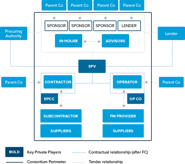 The consortium that responds to the procuring authority’s RFP will typically include the following key private partners, all of whom may be required to bid together on an exclusive basis.