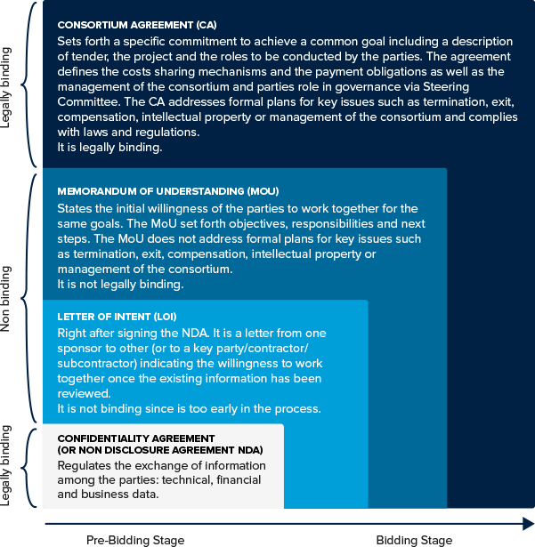 Once the consortium is formed, the next requirement is for the sponsors to put suitable bidding arrangements in place. These will normally take the form of a Letter of Intent or Memorandum of Understanding that will be entered into by the sponsors, which will set out their intention to bid together, normally on an exclusive basis. These agreements may not be binding. However, a more formal and binding agreement, known as a “consortium agreement”, may be agreed to by the sponsors.