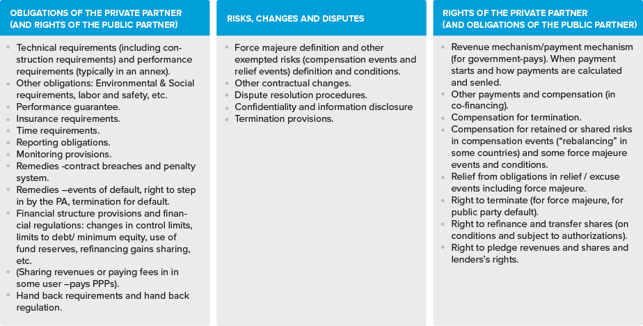 Above all, a contract governs the obligations and rights of the parties. Everything starts from a clear definition of the scope of the contract and the responsibilities of the private partner for the full contract cycle. This includes prescriptions and descriptions of output targets (design, construction and financing, commissioning, operate and maintain, hand-back) followed by the private partner’s economic rights (the right to receive payment for the work done). This latter provision implies that the main obligation of the public partner (that is, to pay required amounts when due) reaches its maximum complexity when dealing with government-pays payment mechanisms.